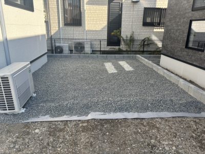 地面をしっかり整えてから、防草シートを敷き、砂利を敷いていきます‼