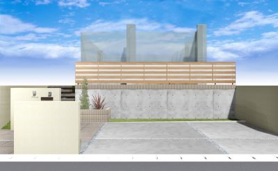 奥には高さのあるコンクリート擁壁があるため、圧迫感を軽減する目的で、上部に木調フェンスを組み合わせたプランに。
