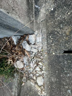 今回の現場では、既存のコンクリートや舗装部分に劣化や破損が見られました。長年の使用や雨水の影響により、表面が傷んでいたり、部分的に欠けている箇所も確認できました。こういった部分はそのまま施工してしまうと仕上がりや耐久性に影響が出てしまうため、事前の確認がとても重要になります。